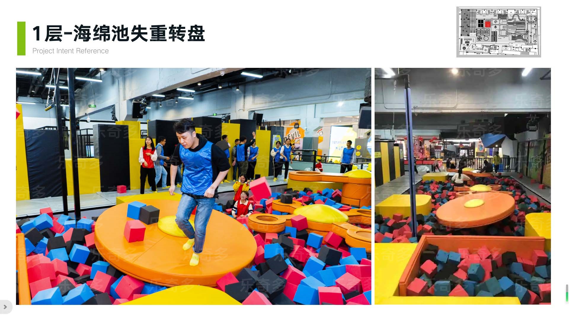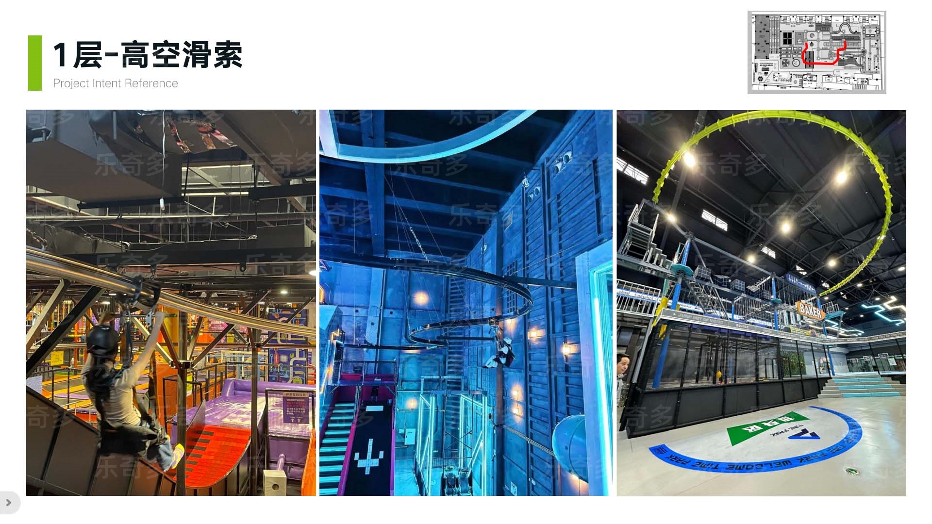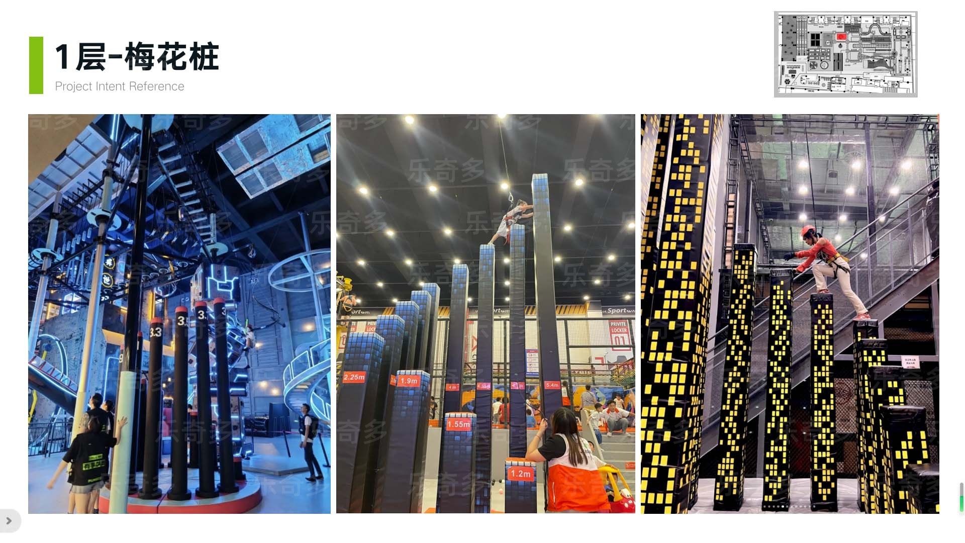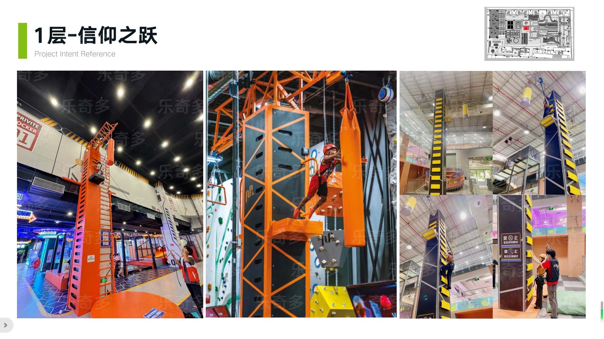 項目玩法:造型打卡點、繞柱螺旋樓梯、牽引球、高空項目樓梯、二三層跳樓機、不銹鋼滑梯、魔方攀巖、趣味攀巖、旱雪滑梯快速通道、旱雪滑梯、360自行車、桁架闖關、激光密室、海綿池對抗、鏡子迷宮等。