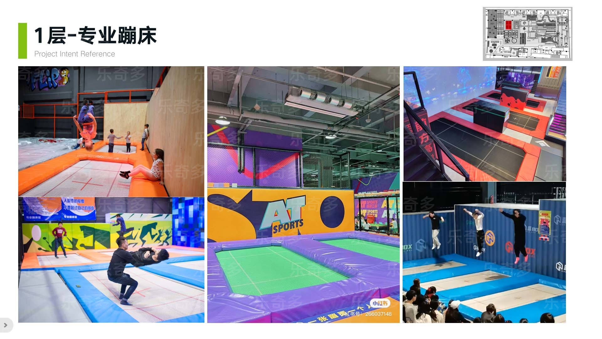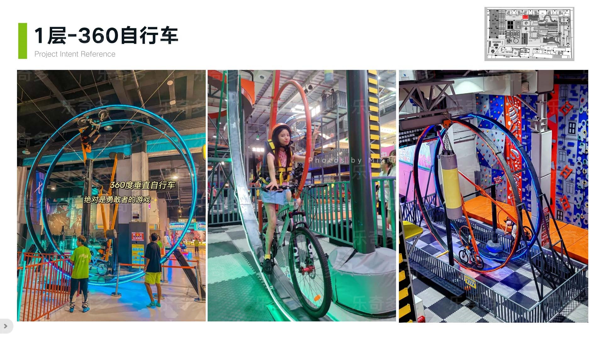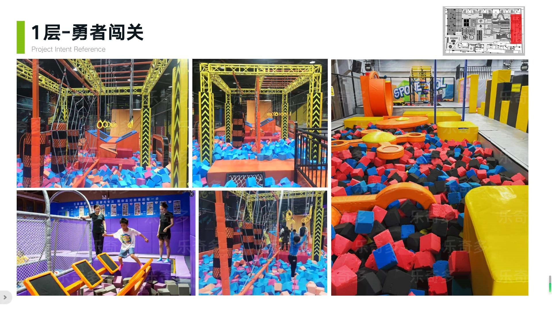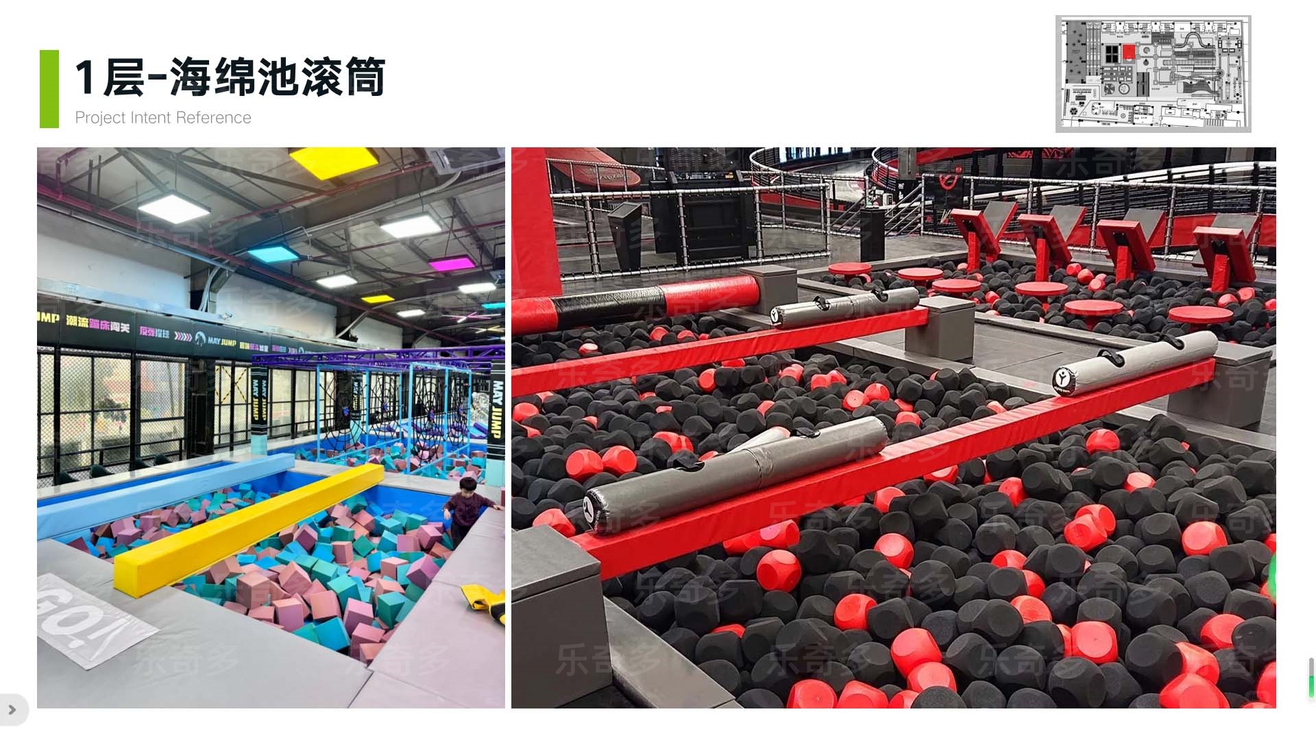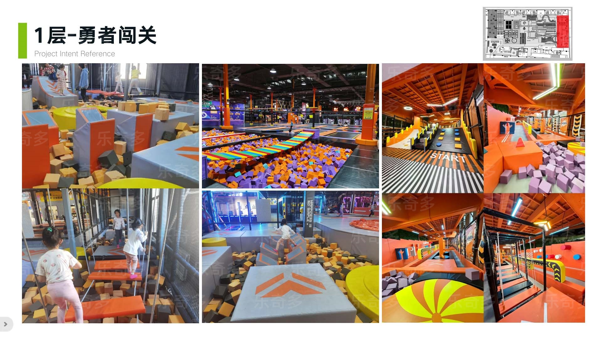 項目玩法:造型打卡點、繞柱螺旋樓梯、牽引球、高空項目樓梯、二三層跳樓機、不銹鋼滑梯、魔方攀巖、趣味攀巖、旱雪滑梯快速通道、旱雪滑梯、360自行車、桁架闖關、激光密室、海綿池對抗、鏡子迷宮等。
